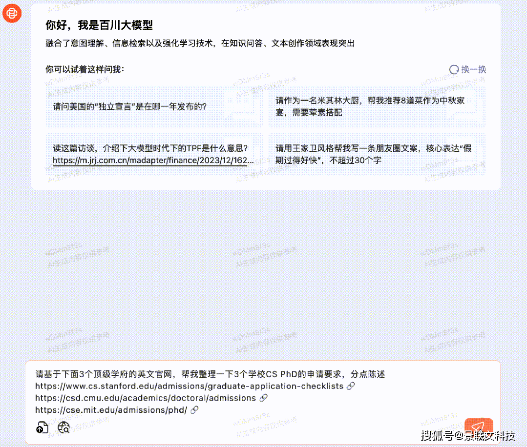 API的完整体验虽然很难展现,但我们可以通过百川智能官网的模型管中窥豹的感受搜索增强带来的体验升级。现在,你可以直接甩给Baichuan2-Turbo-192K五个公众号文章的链接 ,让它总结出这些爆款文章的共性。把18页28k的特斯拉22年第四季度财报会议总结拖进Baichuan2-Turbo-192K,可以让它一次性输出会议纪要,包括财务业绩和市场需求、产品和技术发展、企业战略和未来规划等等。长达51k的商品房买卖合同,出卖人、买受人、建面、价格等重要元素,可以按JSON格式输出。连申请CS PhD,都可以直接把三个学校的官网地址发给它,Baichuan2-Turbo-192K会快速整理出申请Stanford 、CMU、MIT CS博士的具体要求。Baichuan2-Turbo-192K可以最多上传20个文件,每个最多50M。相比之下,Claude最多能传5个文件,每个文件最多10M。