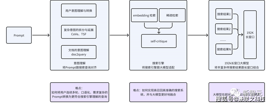 大模型时代,用户信息需求表达方式发生了巨大变化,输入方式上用户的问题不再是一个词或短句,而是变成了更自然的对话互动甚至是连续多轮对话。问题形式也更加多元,并且紧密关联上下文。输入风格上更加口语化,输入问题趋于复杂化。百川知识库意图理解,采用自主研发的百川大语言模型进行微调,能够将用户连续多轮、口语化的Prompt信息,转换为更符合传统搜索引擎理解的关键词或语义结构。通过这种方法,就能更好地桥接全新的用户需求表达与现有搜索技术之间的差距。为了应对用户的复杂需求,团队借鉴了Meta的CoVe技术,将真实场景中用户的复杂Prompt通过大模型转换并对齐,进一步拆分为多个独立、可并行检索的搜索友好型查询。并且,自主研发的TSF(Think Step-Further)技术,能够让系统洞察用户输入背后的深层问题。此外,团队还采用了一种独特的doc2prompt技术,来增强文档与Prompt之间的对齐。通过生成与文档内容紧密相关的问题Prompt,就能够提升系统对用户意图的捕捉精度,让检索结果更准确。