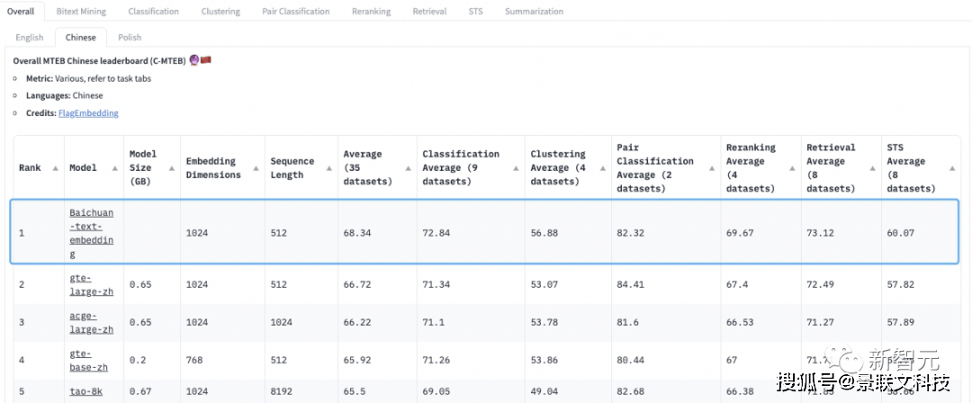 用户需求与搜索查询的匹配程度越高,大模型的输出结果越好。模型要想进一步提升知识获取的效率和准确性,除了更好的理解用户意图,还需要更强大的检索和召回解决方案。虽然借助Embedding模型,能很好地解决用户需求和知识库的语义匹配问题。但是,在知识库场景,用户的数据通常是私有化的。在这种情况下,Embeding模型就存在比较严重的退化问题,需要结合稀疏检索和Embedding模型技术实现高召回、高精度的检索系统。此外,针对搜索系统召回的结果,则需要通过搜索和大模型协同优化,来使其更好地被大语言模型所理解和应用。- 百川自研Baichuan-Text-Embedding(BCTE)模型登顶C-MTEB榜单得益于大模型领域的积累,团队使用了超过1.5T tokens的高质量中文数据进行预训练,并通过自研的损失函数,解决了对比学习对于Batchsize的依赖。最终,Baichuan-Text-Embedding(BCTE)模型在最权威的C-MTEB榜单上取得了Top 1的效果。
